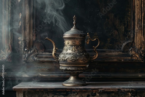 antique, teapot, steam, vintage, interior, metal, aromatic, elegant, timeless, charme, old, traditional, design, culture, history, ornate, decorative, luxury, still, life, object, background, dark, moody, atmosphere, rustic, wood, table, art, craft, bronze, copper, silver, gold, detail, pattern, texture, smoke, warm, inviting, cosy, home, decor, collectable, heirloom, shop, flea, market, tradition