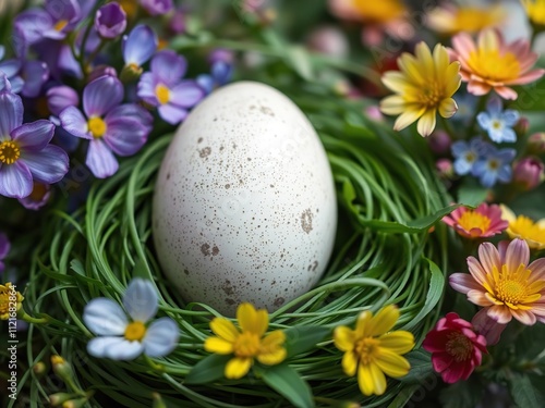 Antique speckled Easter egg nestled among lush greenery and colorful blossoms, distressed wood, vintage finds