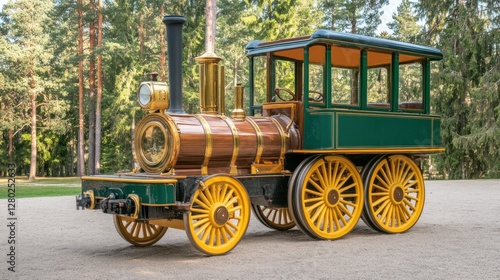 train, locomotive, steam, antique, vintage, retro, classic, old, railway, railroad, engine, transportation, transport, travel, journey, history, heritage, museum, park, summer, day, sunlight, green, gold, yellow, wheel, carriage, technology, machine, metal, wood, vehicle, power, industry, adventure, exploration, past, preservation, artifact, model, scale, display, scenic, landscape, environment