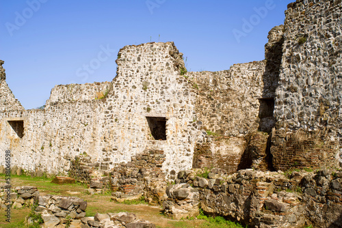 Antique stone ruins on ancient Byzantine fortress of Petra in Georgia, Tsikhisdziri . Historical and archaeological complex "Petra-Tsikhisdziri", 6th century