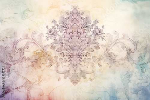 Antique wallpaper design inspired by the French royal court of the 1700's. Weathered and faded inspiration from an old French chateau. Beautiful gold filligree and negative space.
