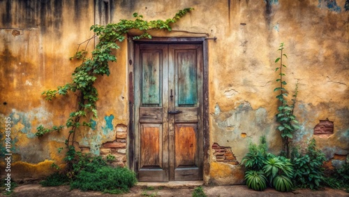 Antique wooden door nestled within a weathered ochre wall, embraced by verdant climbing plants and flourishing groundcover