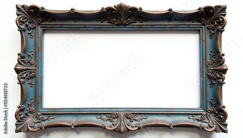 Antique wooden frame with intricate carvings and blue paint isolated on a white background, blue, decor