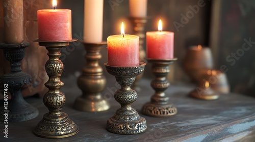 Antique-style candle holders crafted from brass and paired with flickering wax candles