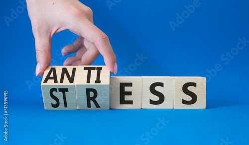 Antistress vs stress symbol. Concept words Antistress vs stress on wooden cubes. Beautiful blue background. Doctor hand. Antistress vs stress concept. Copy space