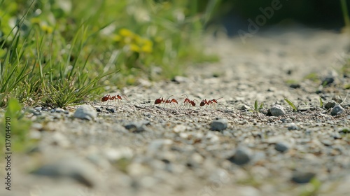 ant, march, gravel, path, nature, insect, wildlife, closeup, ground, small, detail, macro, vegetation, environment, summer, ecosystem, harmony, dirtied, stone, grass, earth, colony, teamwork, foraging, trail, landscape, tiny, active, observation, biodiversity, pattern, photo, animal kingdom, scavenger, movement, biology, scene, subtile