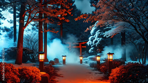 apanese Garden at Night with Lanterns and Torii Gate