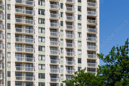 apartment building, building, city, condo, highrise, outdoors, pattern, perspective, sky, skyscraper, town, tree, urban, window