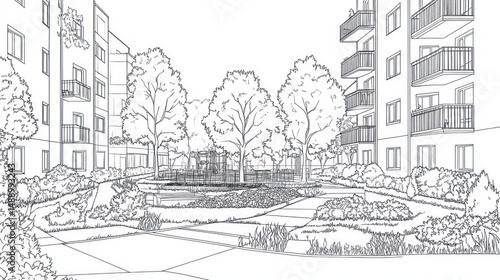 apartment, complex, courtyard, playground, design, residential, building, tree, landscaping, urban, architecture, plan, drawing, vignetting, housing, development, property, real estate, community, space, park, children, play, area, green, nature, garden, view, home, flats, living, lifestyle, modern, contemporary, city, town, suburb, family, children, recreation, leisure, safety