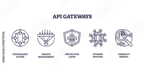 API gateways concept with centralized access, traffic management, and protection layer. Outline icons set.