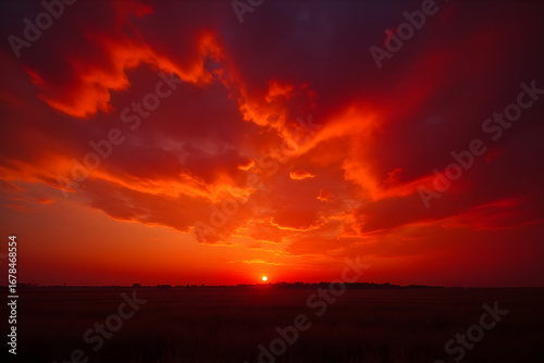 Apocalyptic sunset sky. Red sky on dawn. Field during a stunning sunset.