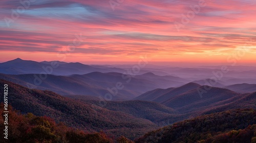 sunrise, mountain, autumn, colours, sky, vista, landscape, morning, sunset, fog, mist, peak, vale, foliage, tree, nature, beauty, view, horizon, elevation, range, ridge, cloud, pink, orange, purple, blue, gold, light, shadow, depth, perspective, mountainous, outdoors, scenic, vibrant, texture, layer, peaceful, tranquil, autumn, fall, wilderness