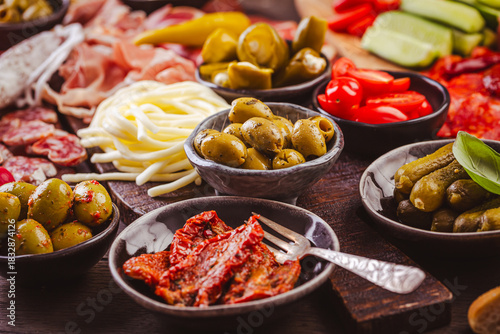 Appertiter platter with assorted meat and cheese, snacks and vegetables