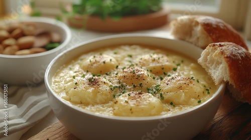 Appetizing Bowl of Creamy Gnocchi or Dumplings in Sauce, Garnished with Chives and Paprika, Served with Crusty Bread, Almonds, and Sausage in a Cozy, Natural Light Setting.