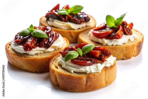 Appetizing bruschettas topped with sun-dried tomatoes, cream cheese, and drizzled with balsamic vinegar, isolated on a white background, showcasing a mouthwatering Italian-inspired snack.
