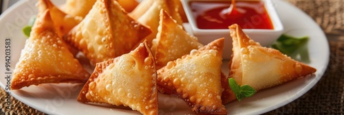 Appetizing Fried Crab Rangoons with Cream Cheese Filling and Sweet Sauce on a Plate