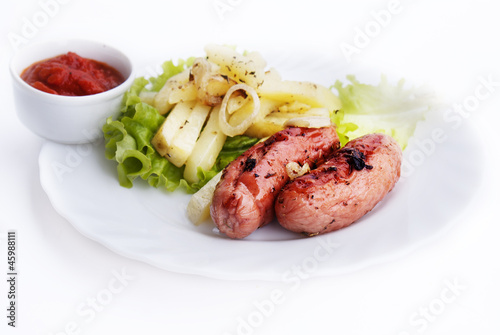 Appetizing fried sausages with a tomato sauce and a fried potato