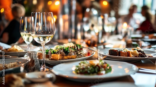 Appetizing gourmet dinner setting with wine glasses and elegant plating : Generative AI