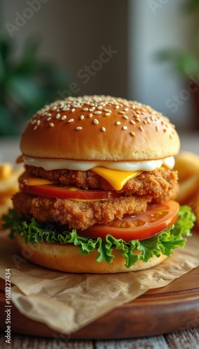 Appetizing hamburger with cheese, lettuce, and fried chicken indoors