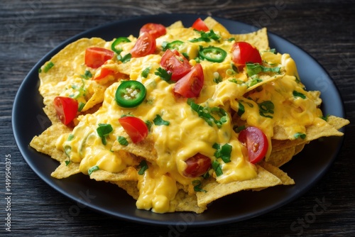 Appetizing Nachos with Melted Cheese and Fresh Toppings on Dark Plate Overhead Shot