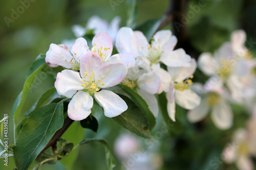 Apple blossom on a branch in spring garden. White flowers with leaves