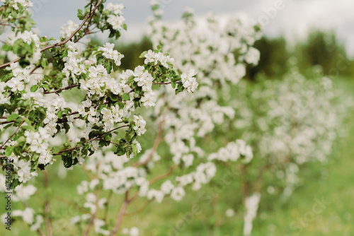 Apple blossoms in spring. Nature comes to life. The bee collects pollen from the flowers of the tree. Blooming time in spring. Change of weather and seasons. Apple garden alley with flowers