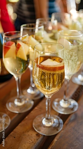 apple, cider, mimosa, glasses, drink, beverage, alcoholic, sparkling, wine, wooden, table, wood, fruit, party, celebration, festivity, refreshment, cocktail, brunch, gathering, food, glassware, liqueur, alcohol, citrous, champaign