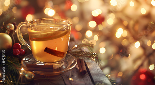 Apple Spiced Cider, on a light table, Against a background of glare and Christmas.