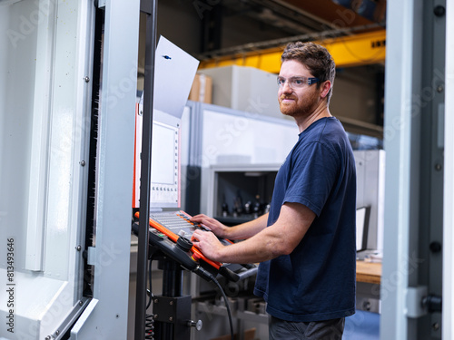 apprentice, engineer, operating, machine, factory, technology, 1, people, industry, adult, man, day, occupation, job, expertise, men at work, device, working, workplace, protective, workwear, clothing, safety, goggles, standing, mid, control, caucasian, blue, colours, looking, protection, equipment, industrial, building, engineering, workshop, technician, manufacture, metal, milling, tool, male