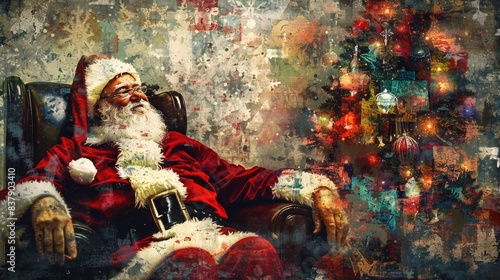 appy santa clause relaxing under the christmas tree after a hard days work. Abstract digital art with texture.