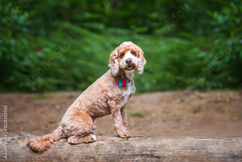 Apricot Cockapoo in the forest in Lightwater sitting on a log