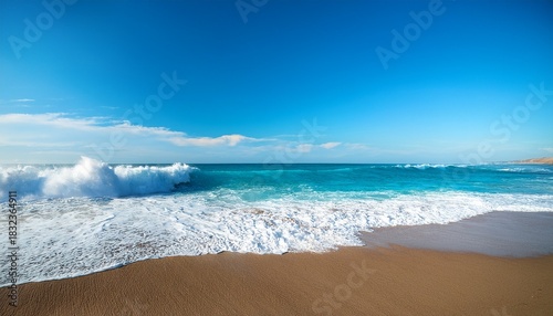 Aqua Ocean Waves Crashing Along The Sandy Shore Creating Sea Foam With White Spray On A Sunny Day