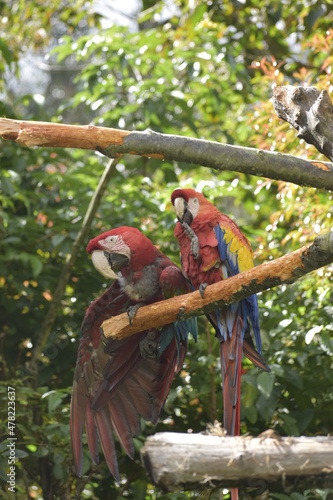 Ara militaris y Ara macao, guacamaya aliverde y guacamaya bandera sentadas sobre un tronco al aire libre