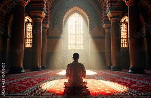 Arab Muslim man prays in mosque. Man sits on prayer mat, focused on spiritual practice. Sunlight streams through grand window, religious atmosphere. Interior architecture of mosque visible. Scene