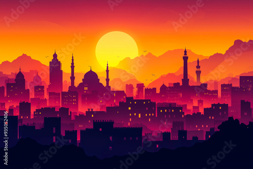 Arabian cityscape, Mosque and house silhouettes. Night city buildings, sundown mountains. Vector urban panorama card