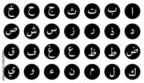arabic, alphabet, latter, arab, rudiments, typography, study, isolated, collection, education, language, islam, learn, school, book, children, elementary, text, font, islamic, qatar, calligraphy, cute, read, character, type, black, graphic, texture, vector, illustration, element, muslim, baby, childhood, decoration, pictogram, logotype, icon, symbol, buttons, set, circle, shape, white, background, signs