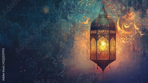 Arabic lantern, intricately designed with delicate patterns, glowing warmly in celebration of Ramadan.