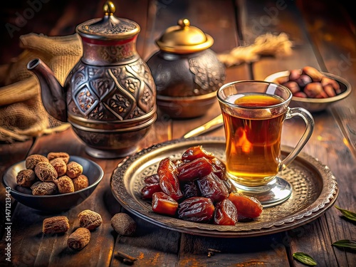 Arabic Tea with Dates & Sugar, Low Light, Artistic Still Life