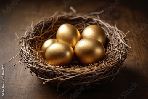 arafed nest with four golden eggs on a wooden table