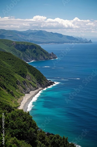 arafed view of a beach and a body of water with a mountain in the background