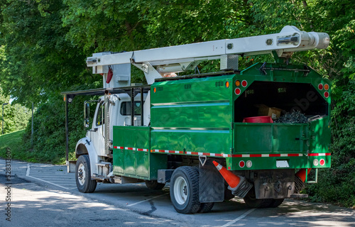truck, utility, bucket, lift, forestry, arbour, equipment, service, vehicle, green, white, parked, forest, tree, park, no people, nobody, lorry, machinery
