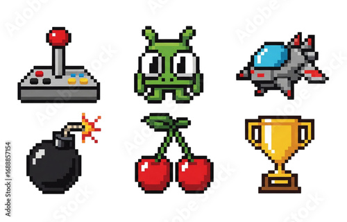 Arcade video game pixel art icons set with joystick, alien, spaceship, bomb, cherries, and trophy