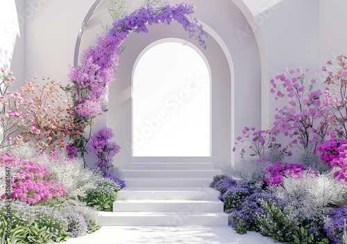 arched wall with an arch in the middle, stairs leading up to it, white background, purple and pink flowers around the arches