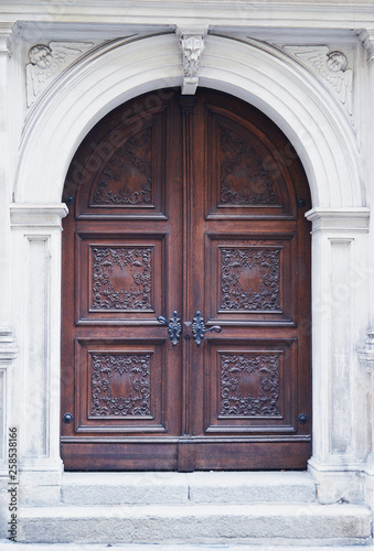 Arched wooden door with white stone surrond