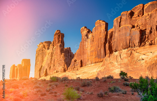 Arches National Park in summer season with red sandstone formations and clear blue sky in Utah