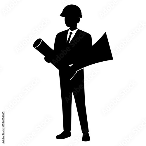 architect, blueprint, plan, construction, building, design, engineer, hard hat, suit, attaching, scroll, professional, planning, strategy, development, project, career, occupation, white background, silhouette, black-and-white, graphic, illustration, vector, graphic design