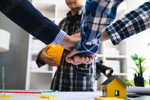 Architects and designers are talking about Construction plans before being delivered to the engineering team and foremen for construction. Audit concept Plans from a team of architects and designers