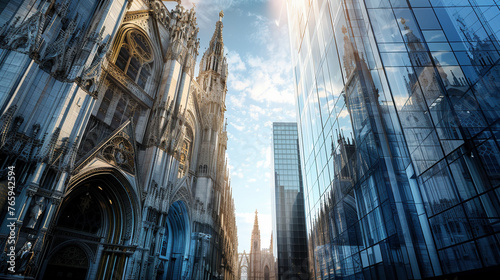 architecture, contrast, traditional, modern, building, city landscape, cathedral, skyscraper, urban, juxtaposition