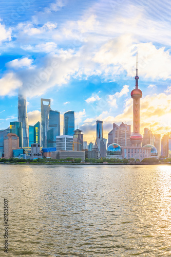 shanghai, skyscraper, river, asia, coast, construction, commercial, exterior, oriental, destination, tall, beautiful, finance, sunrise, sunset, dusk, light, cloud, blue, yellow, background, metropolis, landscape, waterfront, china, landmark, tower, financial, office, view, scene, famous, sky, urban, water, tour tourism, city landscape, city, skyline, architecture, modern, travel, business, downtown, building