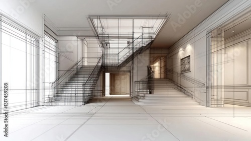 architecture, hallway, staircase, interior, design, modern, vignetting, perspective, luxury, entrance, structure, building, residential, contemporary, illustration, draft, abstract, construction, geometric, clean, line, light, shadow, space, open, minimalist, white, black, drawing, blueprint, detailed, visualisation, composition, style, artwork, concept, plan, elevation, home, elegant, view, background, art, empty